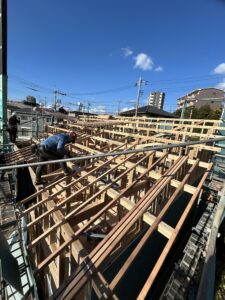晴天の中、1月にしては比較的暖かく、棟上日和での工事となりました!